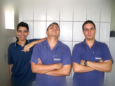 Bitte keine Kommentare zu den Haaren im Bild. Ich wusste doch an dem Tag nicht das ich da meine Starfotos machen lasse. Morgen werde ich dann diesen Blog zu Ende bringen, dann wird es auch das letzte Mal gewesen sein, dass ich mich bei euch aus Brasilien melde. Bis dahin wollen euch noch meine Mitarbeiter der Abteilung (von links: Ricardo, Rodrigo, Marquinho; es fehlt Junior und Marcelo) begrüßen.